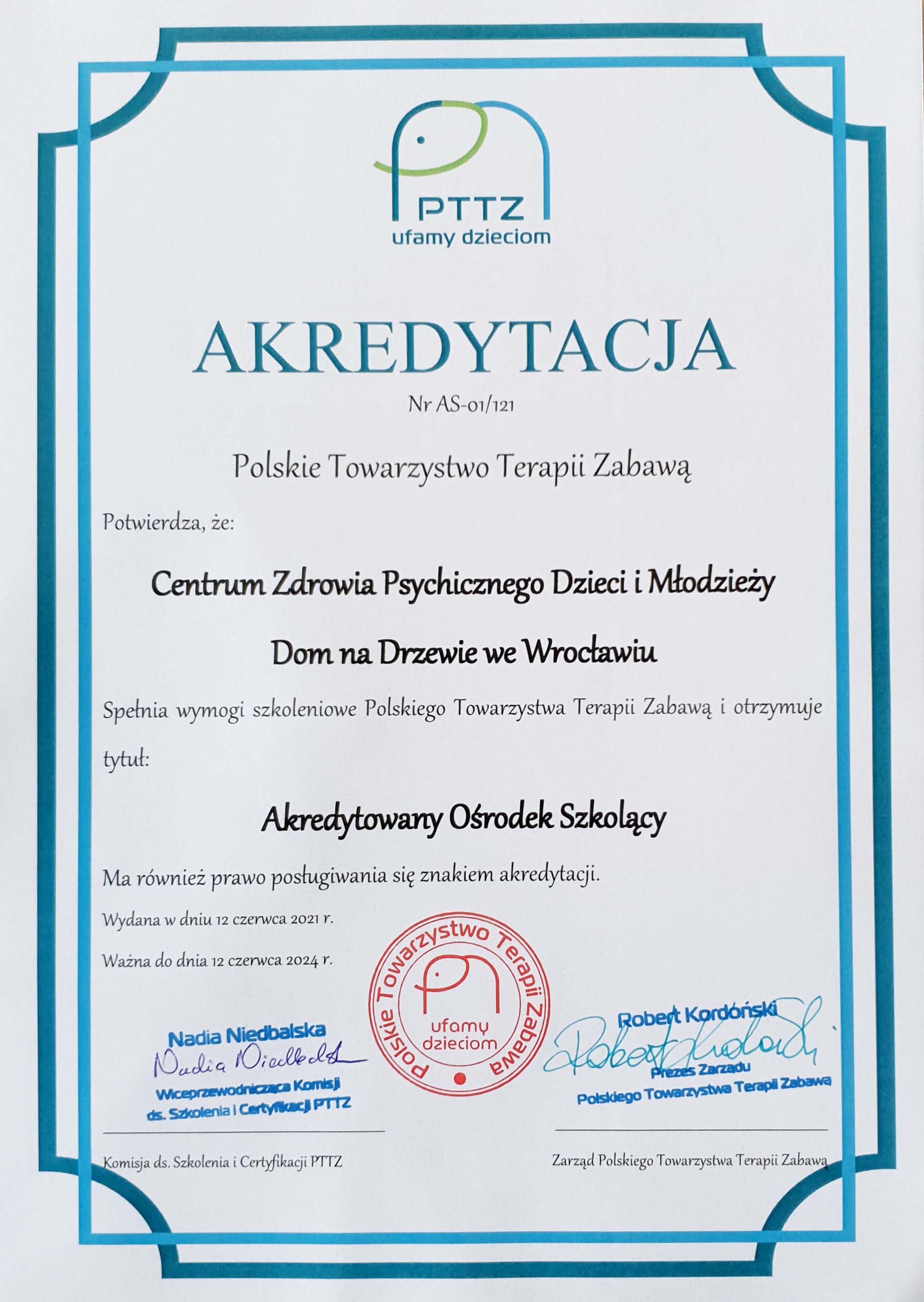Na podstawie rekomendacji Komisji ds. Szkolenia i Certyfikacji PTTZ oraz po zapoznaniu się z przedłożoną dokumentacją, w szczególności wniosku akredytacyjnego, Zarząd PTTZ przyznał tytuł Akredytowanego Ośrodka Szkolącego podmiotowi o nazwie: Centrum Zdrowia Psychicznego Dzieci i Młodzieży Dom na Drzewie z siedzibą we Wrocławiu.